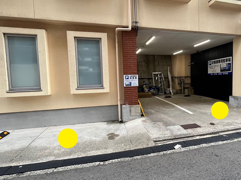 普通車2台駐車できますが、指定の場所になりますので上記の場所(写真の中の黄色点印の位置)に駐車頂けると幸いです。できる限り左に寄せてご駐車お願い致します。